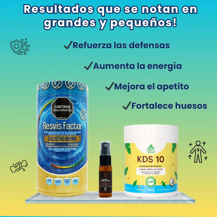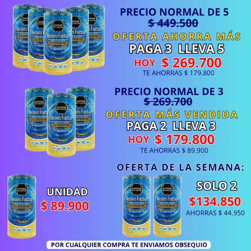 Ingredientes Resvisfactor: Calostro bovino, Proteína de soya, Maltodextrina, Proteína aislada de suero, Quinoa, Malta,  Omega 3-6-9, Colágeno hidrolizado, Hongo shiitake, Betaglucanos, Biotina, Niacina, Vitamina A, Vitamina C, Vitamina E, complejo de vitamina B1-B2-B6-B12, Calcio, Potacio, Hierro, Zinc, Magnesio, Ácido fólico, Ácido pantoténico, Selenio.